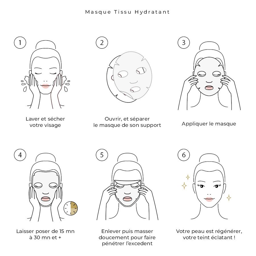 Sur une peau propre et sèche, déposer le tissu et laisser poser, au minimum, 15 min.